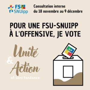 Du 18 novembre au 9 décembre, tou-tes les adhérent-es de la FSU-SNUipp 86 ont l’occasion de s’exprimer en participant au scrutin des élections internes de la FSU-SNUipp 86. Plus vous serez nombreuses et nombreux à participer à ce moment de démocratie interne, plus la FSU-SNUipp sera à l’image de ses syndiqué-es !