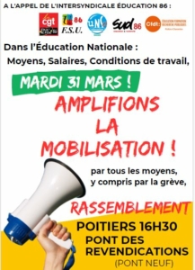 J’indique ma participation : https://mobilisation.snuipp.fr/86/greve-31-mars